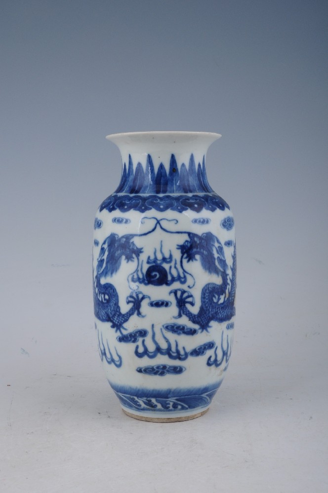 清灰釉青花(huā)龍鳳牡丹紋雙獅耳瓶