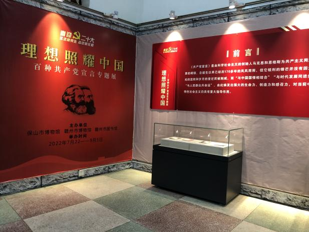 為(wèi)了(le)迎接二十大(dà)的(de)勝利召開(kāi),©∞¶加強跨省館際交流,促進共同發展,拓寬博物≥(wù)館從(cóng)業(yè)人(rén)員(yuán)的(de)專業(yè)知(zhī)φ★識和(hé)業(yè)務技(jì)能(néng),更好(φ↔σ¥hǎo)地(dì)實現(xiàn)區(qū)域資源₽↕∏共享,拓展贛南(nán)地(dì)域紅(hóng)色文(wén)化(huà)對(d©>uì)外(wài)宣傳途徑,2022年(nián)7$✘ו月(yuè)底,新鄉市潞簡王墓博物館選送100γ©件(jiàn)(套)不(bù)同版本《共産黨宣言》,我館布展工(gōng)≤ →作(zuò)人(rén)員(yuán)一(yī)行(÷♠π★xíng)赴保山(shān)市(shì)博物(wù)館開(k ☆γεāi)展主題為(wèi)“理(lǐ)想照(zhào)耀中國(guó)—≤σ"♠—百種《共産黨宣言》專題展”布展工(gōng)σ←作(zuò)。