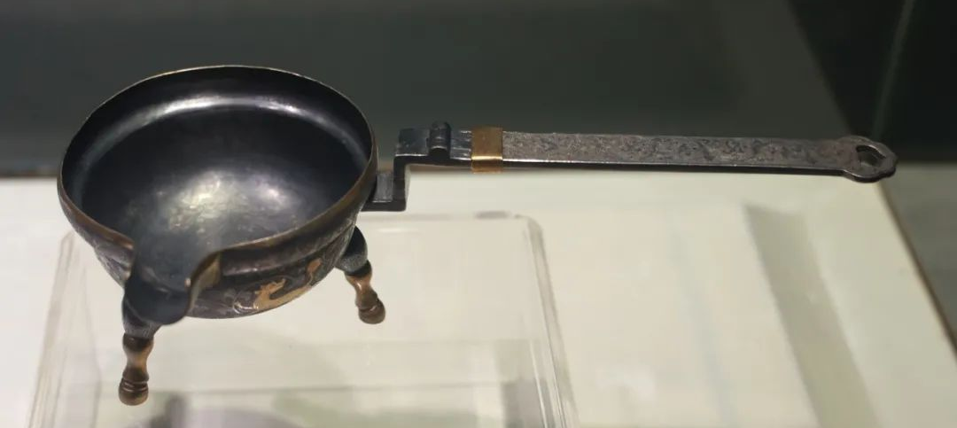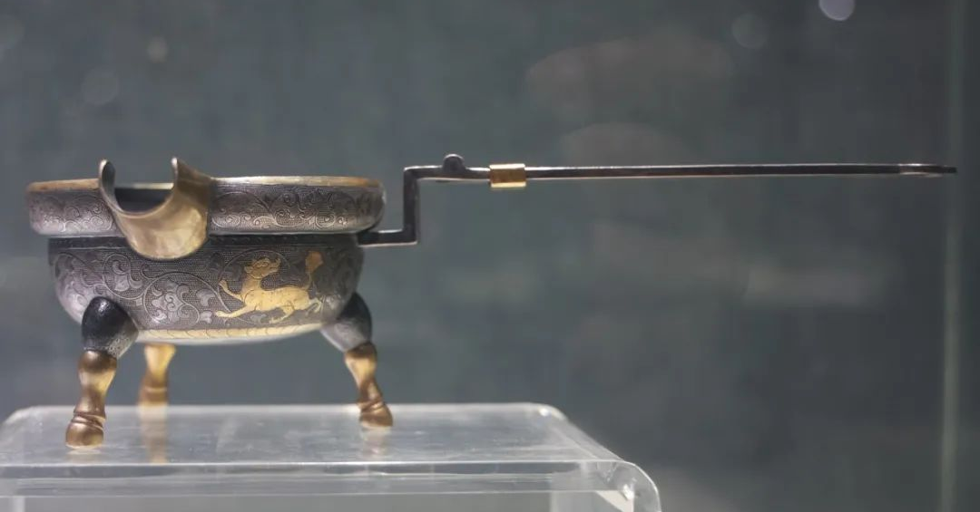 鎏金(jīn)奔獅紋長(cháng)柄三足銀(yín)铛