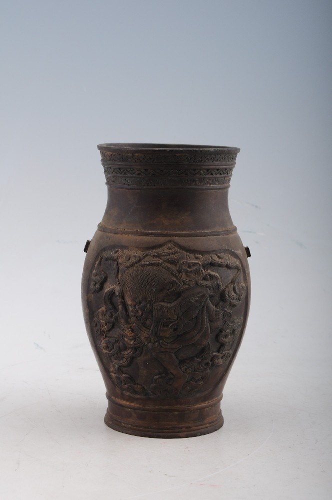 清灰釉青花(huā)龍鳳牡丹紋雙獅耳瓶