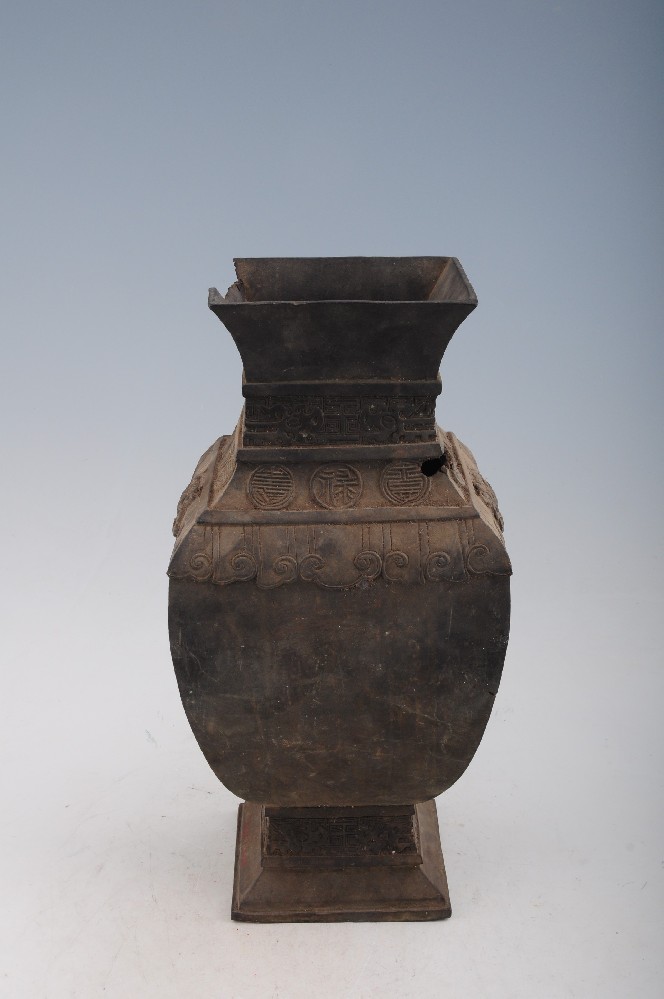 清灰釉青花(huā)龍鳳牡丹紋雙獅耳瓶