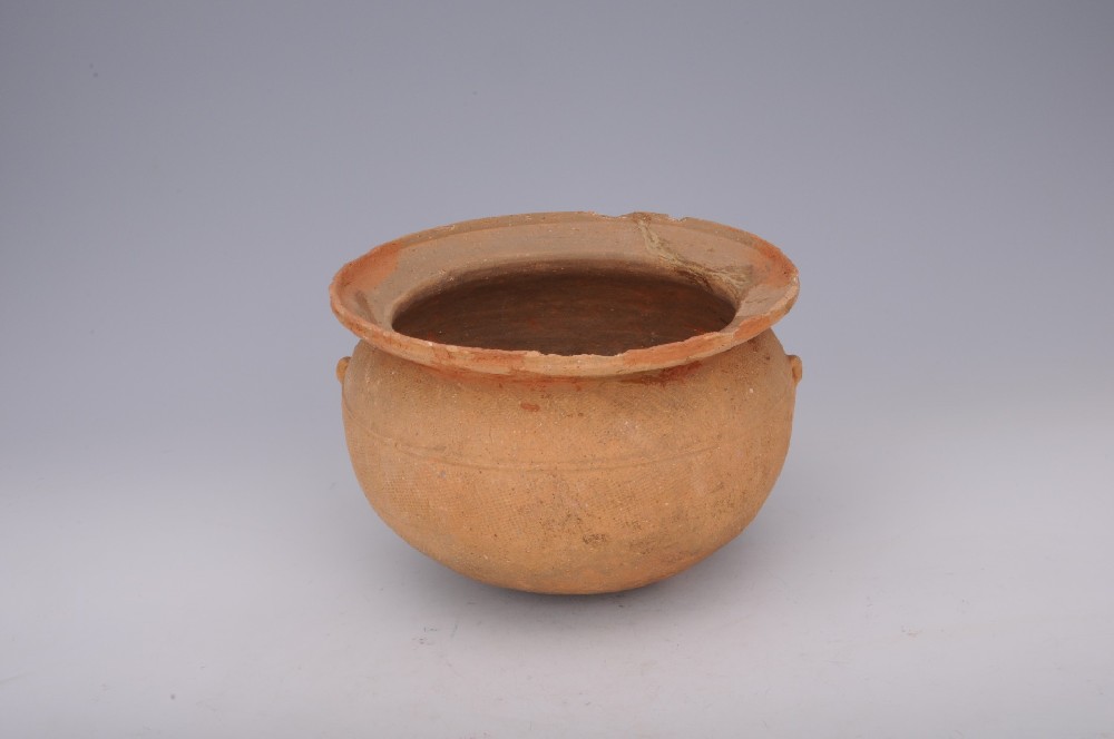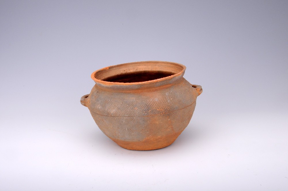 東(dōng)漢細格紋雙耳陶釜