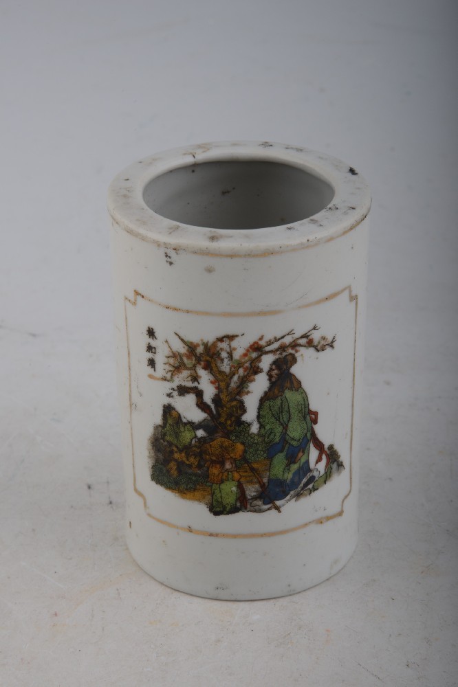 民(mín)國(guó)白(bái)釉貼花(huā)人(rén)物§'≈(wù)紋筆(bǐ)筒