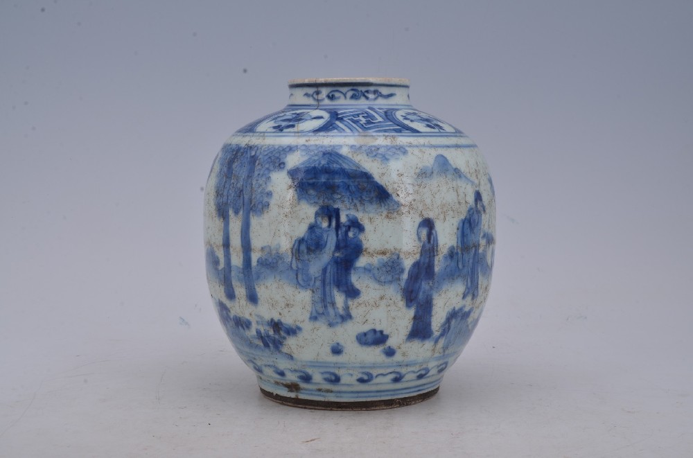 明(míng)青花(huā)才子(zǐ)佳人(rén)遊春圖罐∞δ