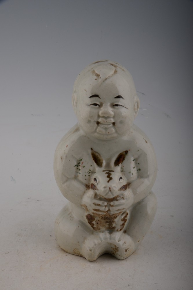 民(mín)國(guó)褐彩孩兒(ér) φ<÷抱兔瓷雕