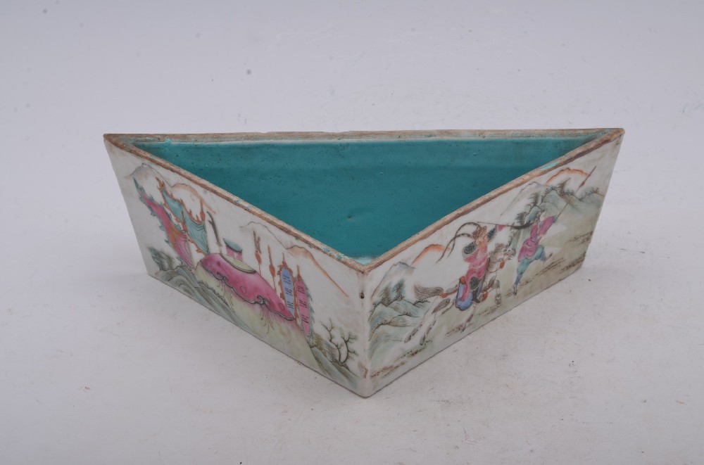 清光(guāng)緒粉款彩人(rén)物(wù)故事(shì)紋三角∏↔形直壁盤