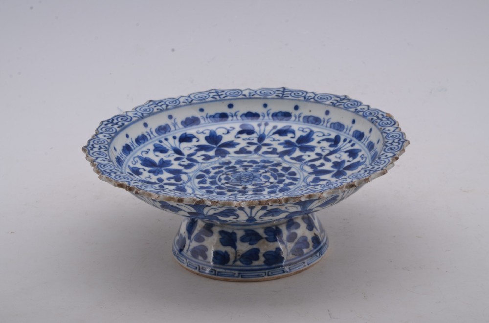 明(míng)青花(huā)花(huā)卉紋高(gāo)足菱口盤