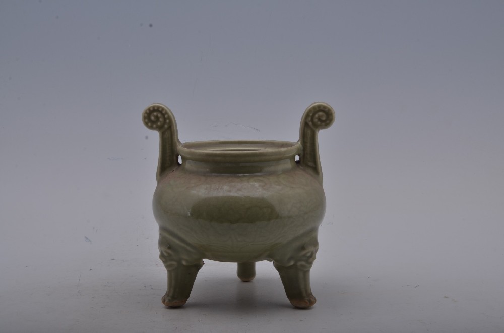 明(míng)青釉刻劃牡丹紋獸足雙耳香爐