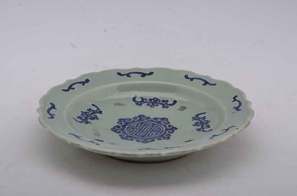 清乾隆款豆青釉青花(huā)五蝠棒壽紋花(huā)口盤
