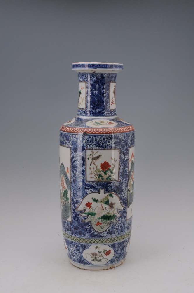 清乾隆年(nián)制(zhì)款青花(huā)錦地(dì)五彩開(kāi)光(guāng•≈←←)山(shān)水(shuǐ)人(rén)物(wù)紋盤口瓶