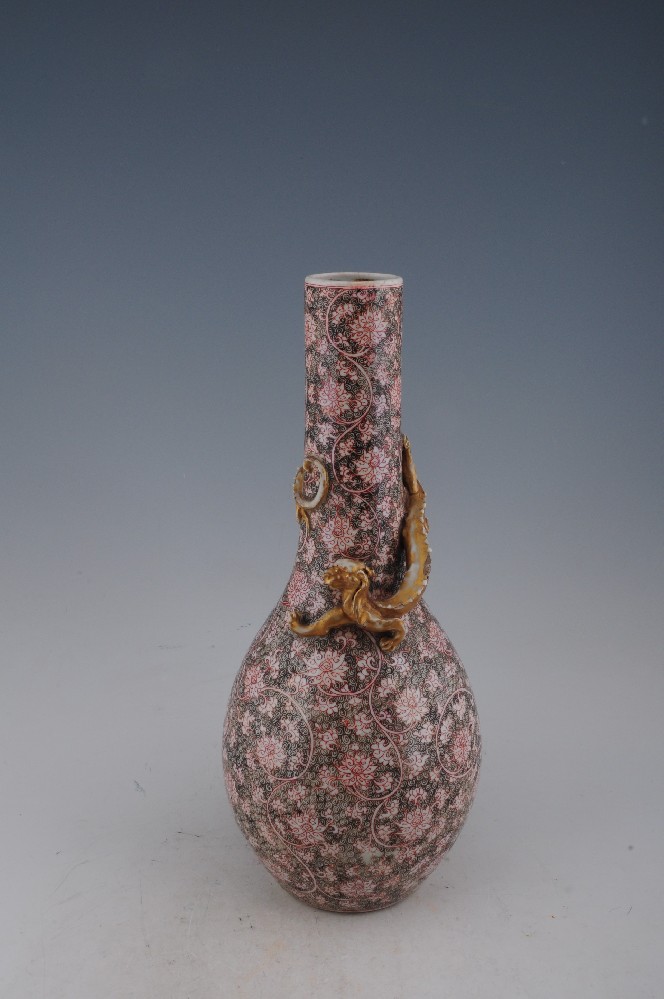 清錦地(dì)紅(hóng)彩雙勾纏枝堆塑蟠螭瓶