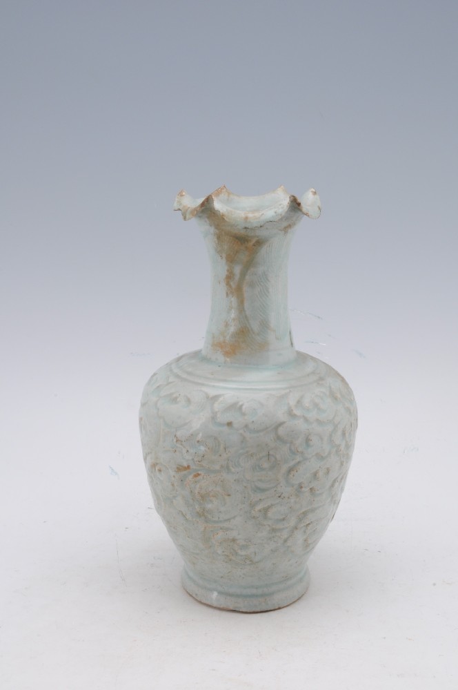 宋青白(bái)釉刻劃蕉葉雲水(shuǐ•✘)紋花(huā)口瓶