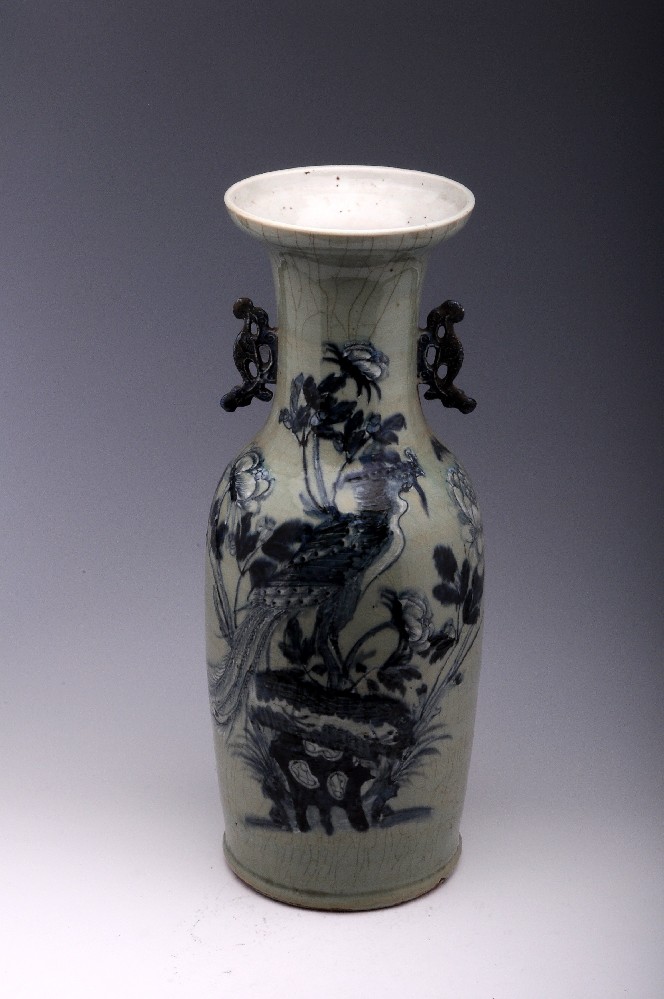 清豆青釉青花(huā)鳳凰牡丹紋瓶