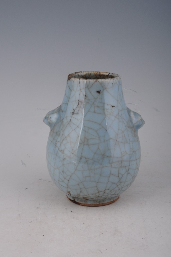 清成化(huà)款藍(lán)釉鐵(tiě)骨泥雙獅銜環耳長(cháng)頸瓶