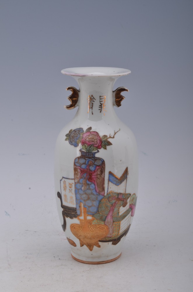 民(mín)國(guó)五彩描金(jīn)博古圖雙耳Ω ★瓶