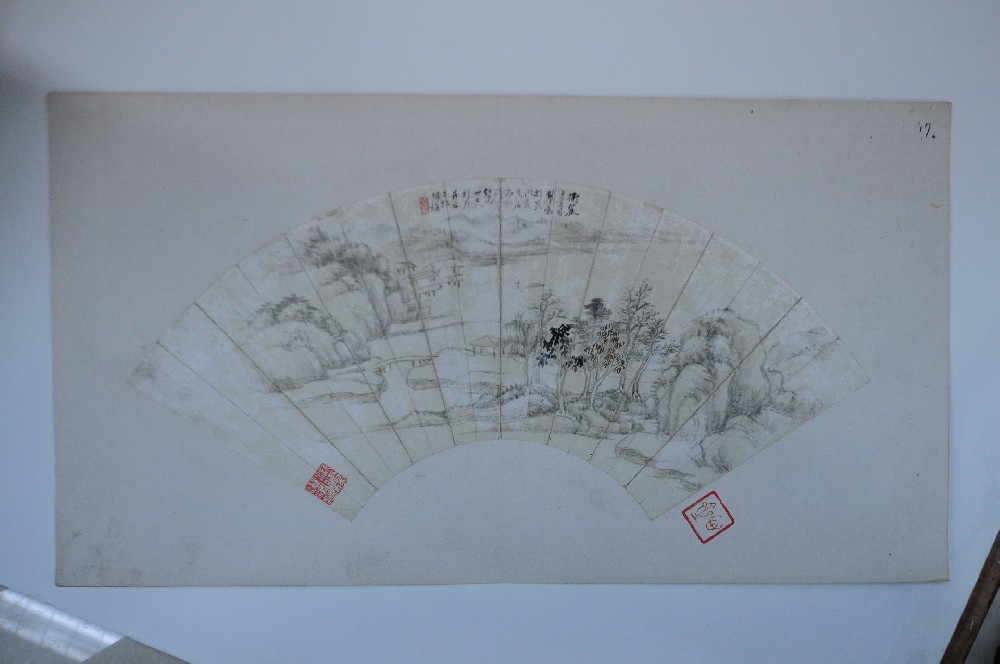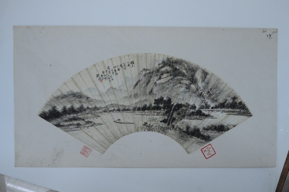 清舒鼎月(yuè)峰司馬大(dà)人(rén)誨正山(shān₩ )水(shuǐ)圖紙(zhǐ)本扇面