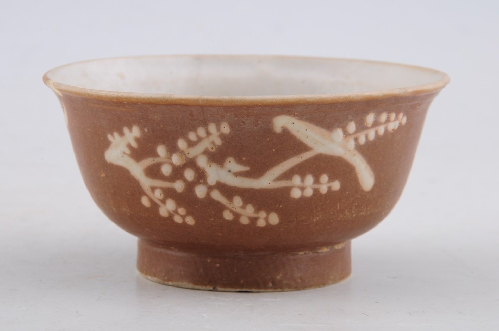 清褐釉堆白(bái)釉花(huā)鳥紋撇口碗