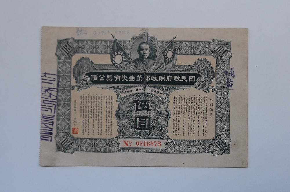 民(mín)國(guó)國(guó)民(mín)政府财政部有(yǒu)獎公債伍圓票(p××↕iào)