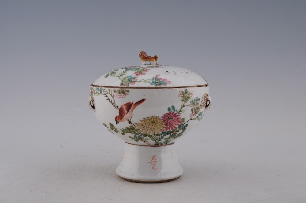 民(mín)國(guó)粉彩花(huā)鳥紋四系高(gāo)足蓋碗
