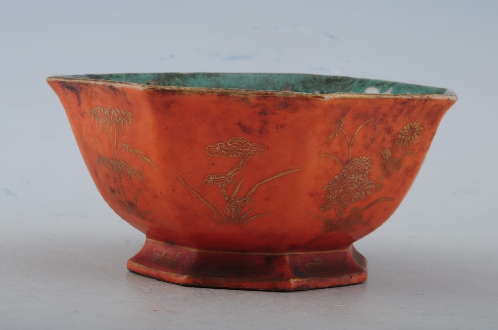 清珊瑚紅(hóng)描金(jīn)花(huāε₽λ<)鳥紋八方碗